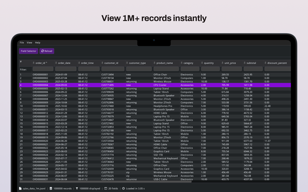 Lightning-fast JSONL viewer for Mac Silicon. Handle millions of rows, filter nested objects with dot notation, analyze logs instantly. Native app, not Electron.